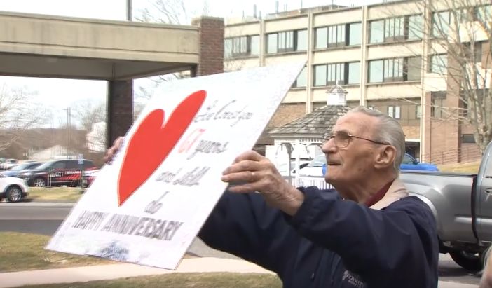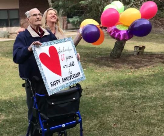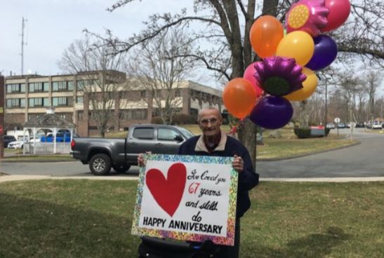 一个耄耋之年的老人,举着缤纷气球和画着爱心的牌子,向隔离中的妻子祝贺结婚67年纪念日。牌子上写着:“我已爱了你67年,我会继续爱下去。结婚纪念日快乐!”