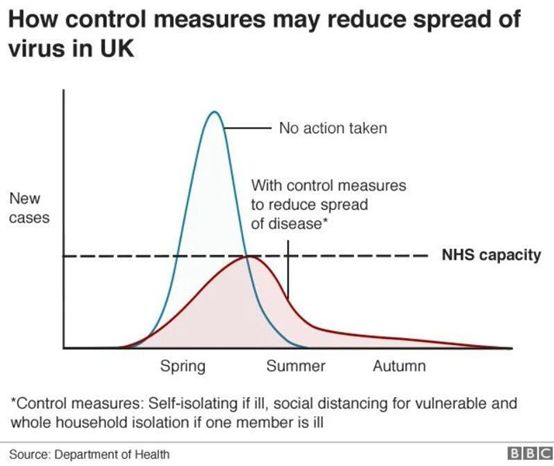 可见,比起被动封锁,英国人目前是有一点主动进攻的意味。但他们并不认为意大利和西班牙的封城封国是错误的,因为意大利和西班牙都已经接近爆发的峰值了,如果英国处于同样的情况,也会采取类似的措施。而他们从现实考虑,封城封国只能封一次,时间也就一个月左右,作为最后大杀器,不能轻易动用,要真正爆发时或爆发前夕用上才有最好效果,现在还没有那么紧急,他们会随着时间线的推移一步步安排。(最新的消息是,首相鲍里斯表示光洗手已经不够了,建议居家办公,无事不出门)类似的,他们认为武汉封城也是必要的,但武汉封城的目的不是消灭病毒,也是延缓感染速度。