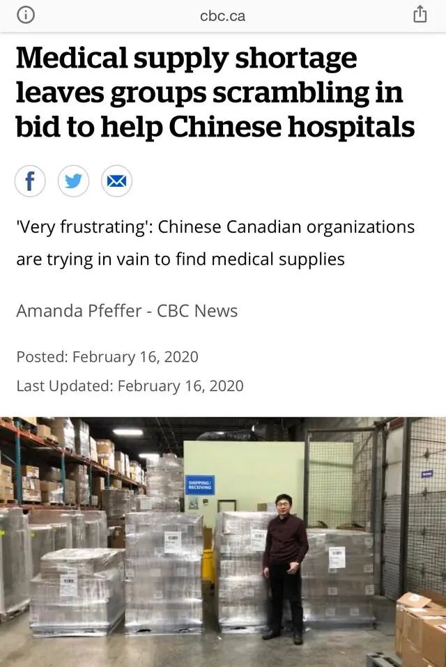 从中国爆发新冠肺炎疫情开始,旅加华人华侨拼命组织购买各种医疗物资运送回国,买空了市场。加拿大政府已向中国捐赠了16吨个人防护装备,包括防护服、医用面具、口罩、护目镜和医用手套。
