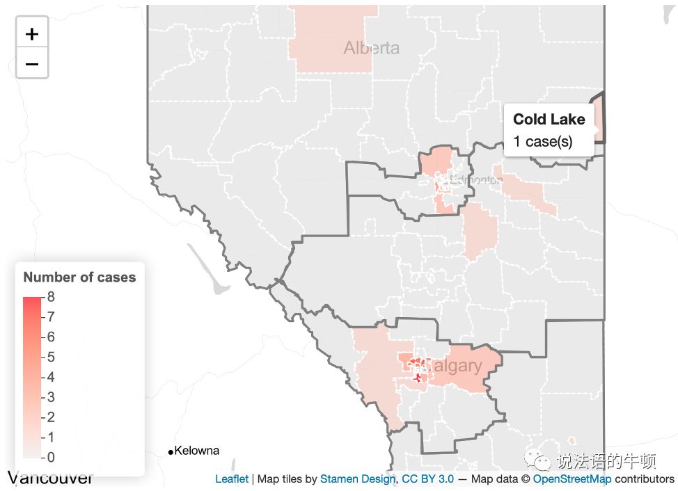 另一个令我颇感兴趣的是这张可缩放可互动的分级统计地图。这是我看到的关于加拿大疫情的第一张利用GIS技术统计疫情数据且数据精确到了选区级别的地图。放大地图后可以看到你所在的地区的确诊病例数量。牛顿所在的地区有3个确诊案例。图中还可以看到,红色密集的区域主要集中在卡尔加里。截止至发稿前,卡尔加里地区集中了全省70%的确诊案例。