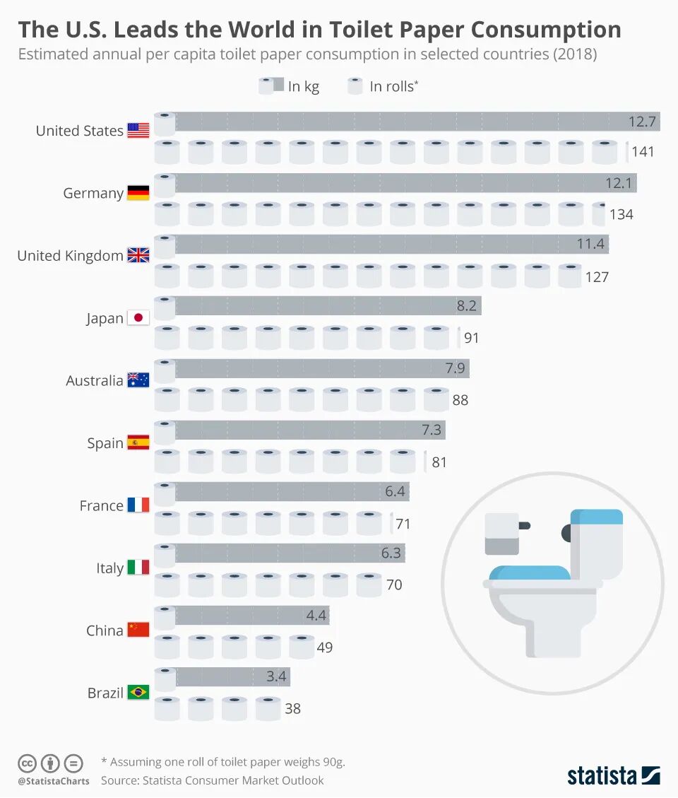 2018 年的一项针对「每人每年厕纸使用量」的调查揭示了世界厕纸消耗的排行榜,此次疫情因为抢厕纸出名的日本、澳洲、美国、英国不出所料地挤入了前 5 名: