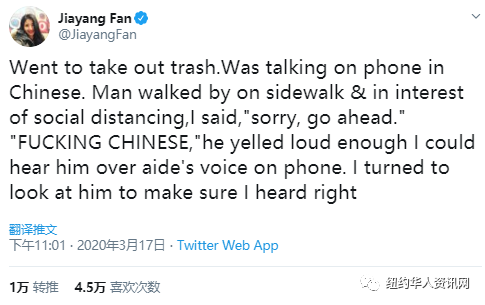 纽约华人资讯网讯  美国主流媒体《纽约客》的美籍华人记者樊嘉扬昨天(3月17日)在曼哈顿受到攻击。另据了解,昨天亦有人冲进曼哈顿中城的一间中餐馆叫喊“中国人滚出去”的口号。