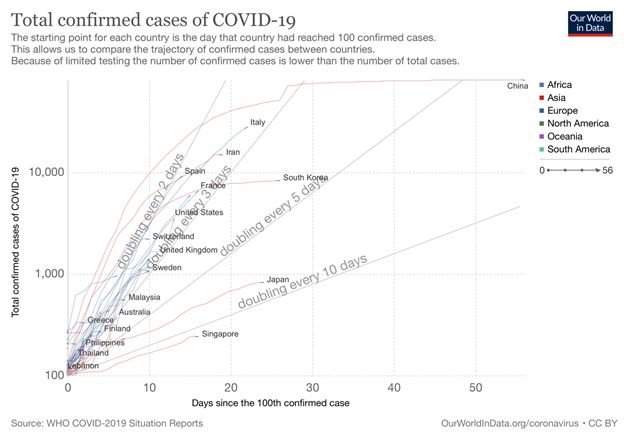 上面是世界各国在超过一百名确诊案例后的疫情发展曲线比较图,截止至3月16日。请注意,疫情在各国发展的起始时间并不一致,但是在图中被移到了同一个起点便于比较。越“平”的曲线说明R值较小,疫情被控制得较好。