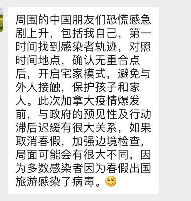 加拿大的感染病例也越来越多了,不过好像大家也都没有什么紧张感,华人也就是在微信群里说说,并没有见到有多惊慌的样子,倒是国内的亲属和朋友,不断的来问我们怎么样了,甚至有要帮我们买口罩的。