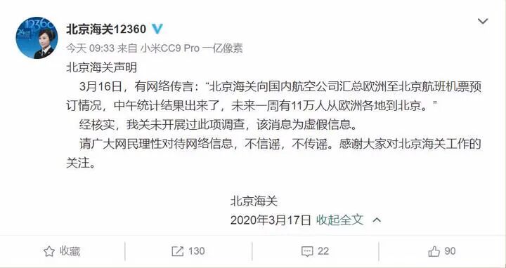 目前,依旧是段子和谣言齐飞。今天早上,北京海关发布声明辟谣——“未来一周11万人将从欧洲到北京”为假消息。