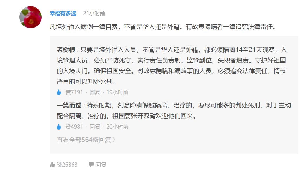更有人怒骂隐瞒病情回国的人:“祖国建设你不在,千里送毒第一名”。