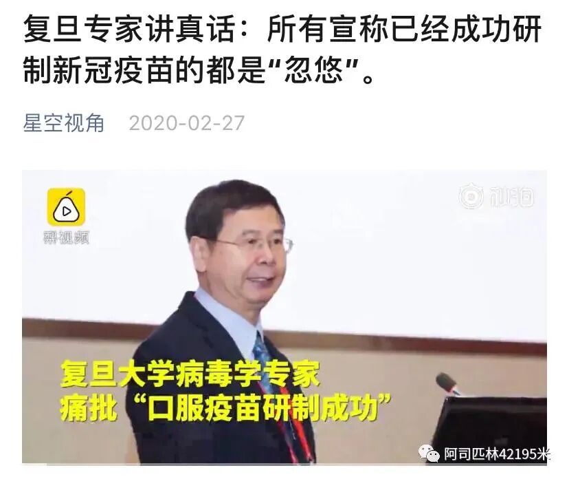 地球那边,复旦大学病原微生物研究所所长姜世勃教授也在忙于纠错,他说:所有宣称已经成功研制新冠疫苗的都是“忽悠”。