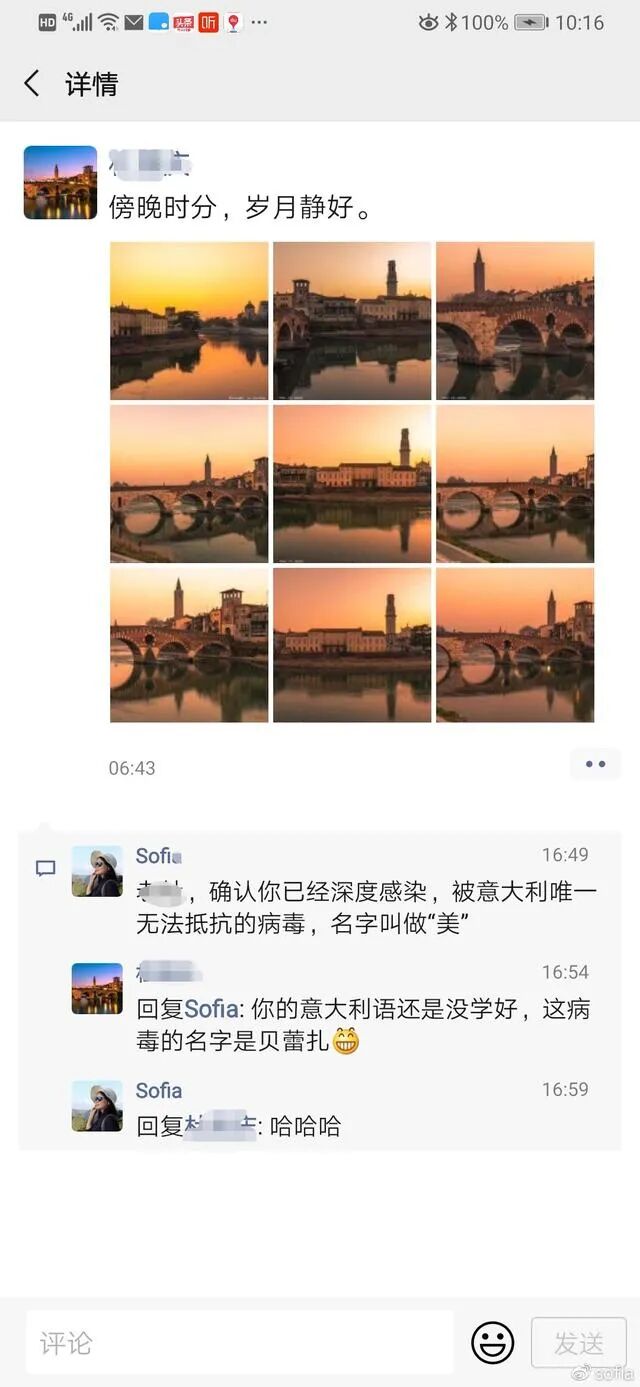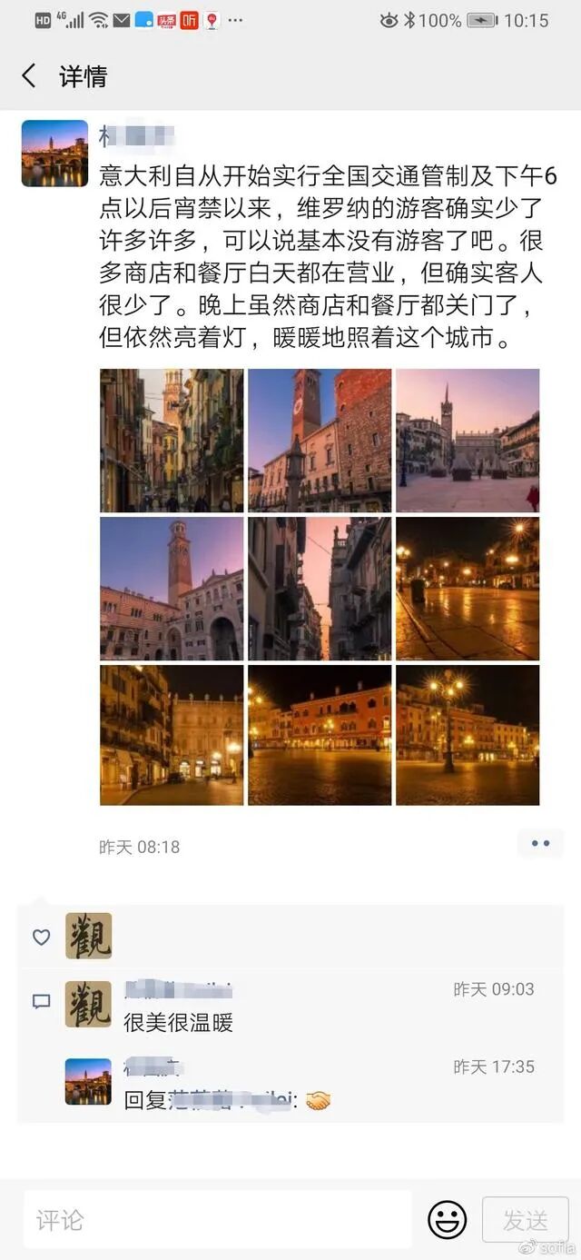 看看我在维罗纳的师兄的朋友圈吧。他在日本做教授,到意大利做访问学者,刚去没几个月就碰上了疫情。但他依然会在黄昏走去人少的地方,感受那一份动人心魄的魅力。