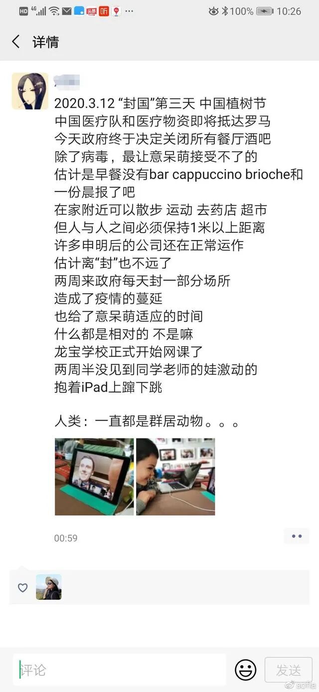 我的脸书里,前几天还没有一个意大利朋友在谈疫情,都是花花草草美食美景,自从“封国”令颁布之后画风大变, 很多朋友表示“这是前一阵,某些人不负责任的行为带来的后果,面对没有常识的人,只能硬来”。