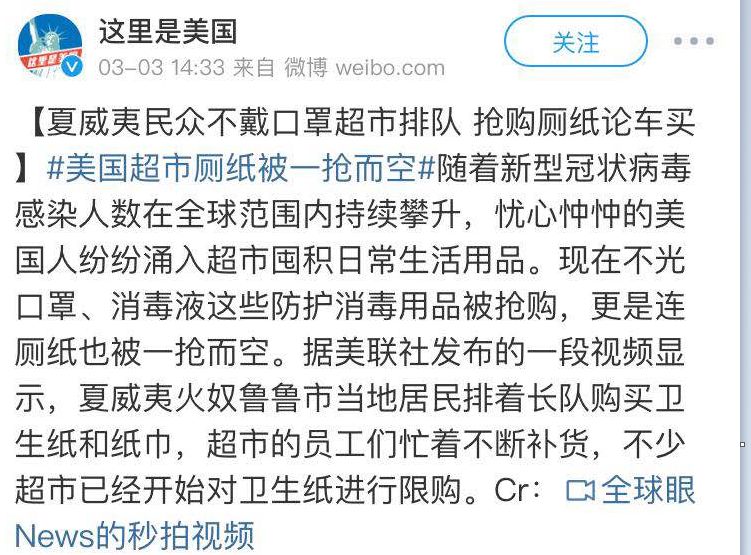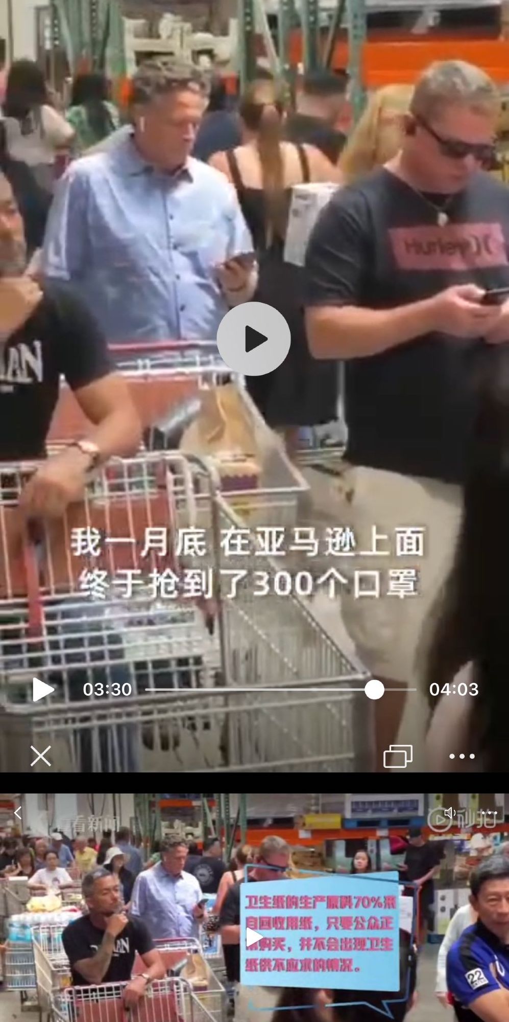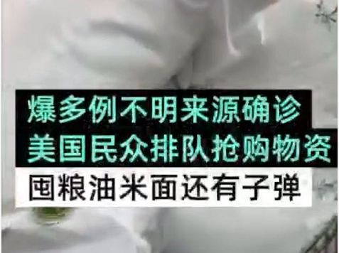 这段长达数分钟的短视频在国内和海外华人各微信群疯传,视频上标注地点在加州,画面加背景音显示很多华人都在慌乱的抢购米、水、卫生纸等物资,此女子还说“