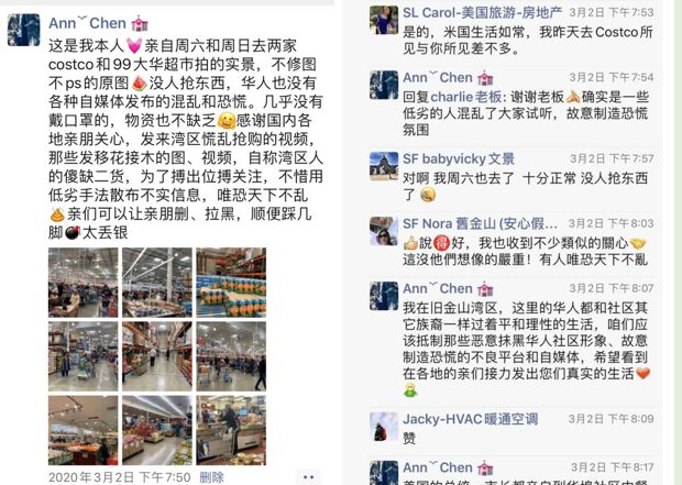 湾区群友很快在网上找到了发布视频的华人女子,并质疑她视频中华人群体在超市抢购画面的真实性。
