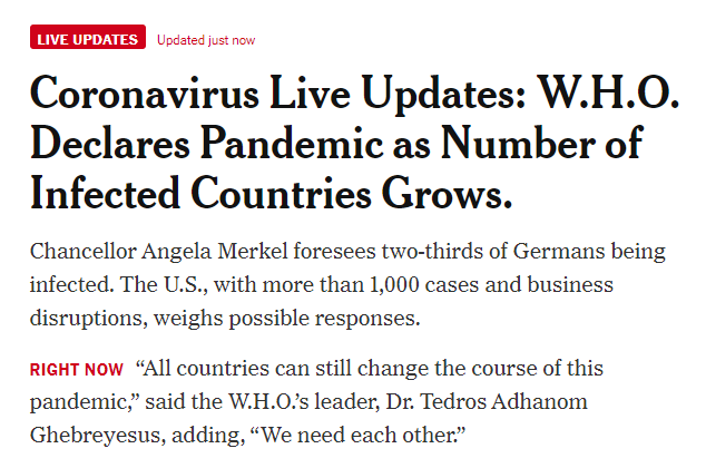美西时间2020年3月11日,世界卫生组织(World Health Organization)官员表示,目前新冠病毒在100多个国家的传播已构成全球大流行(Pandemic),证实了许多流行病学家数周来的说法。德国总理默克尔称,约三分之二的德国人或许会感染covid-19病毒。
