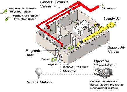 负压病房 Negative pressure ward是指病房内的气压低于病房外的气压的病房。在特殊的装置之下,病房内的气压低于病房外的气压,这样的话,从空气的流通来讲,就只能是外面的新鲜空气可以流进病房,病房内被患者污染过的空气就不会泄露出去,而是通过专门的通道及时排放到固定的地方。这样病房外的地方就不会被污染,从而减少了医护人员被传染的机会,这种病房最适合安置类似非典,新冠这样的呼吸道传染性疾病病人。