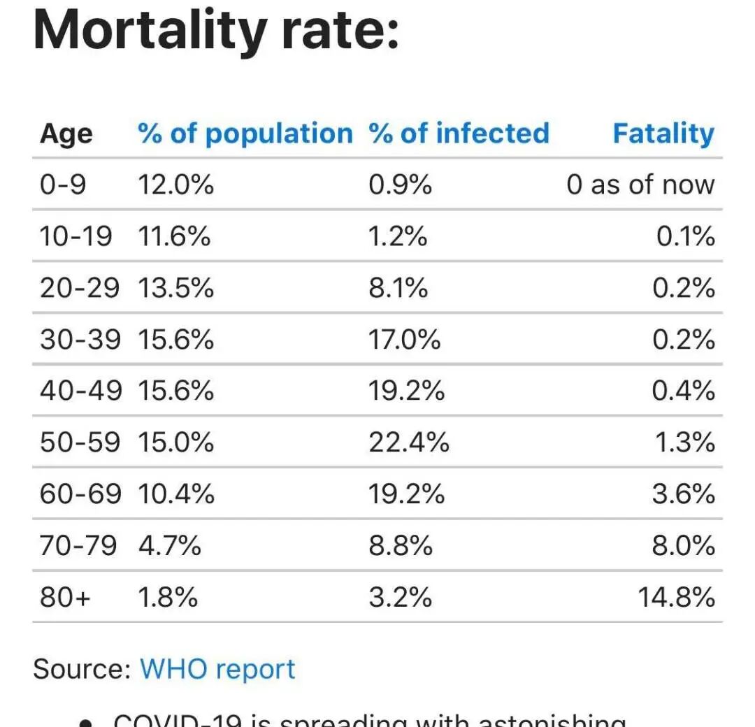 为人父母,很多时候关心子女的健康比自己更多。与流感不同而与SARS一样的是,新冠肺炎对儿童似乎网开一面。各种数据都表明儿童的风险比成人小很多。3月4日深圳医学工作者与John Hopkins大学合作的研究论文发现,儿童受病毒感染并不比成人低太多,然而儿童发病要少很多。在流感季节,儿童的感染率很高并且常常是一个家庭中的病源。现在尚不清楚感染新冠病毒的儿童的传染性有多高,但是新冠肺炎在世界上已经传播近两个月,尚未发现任何儿童是家中长辈被感染来源的案例,这表明,很大的可能性是:儿童即使感染病毒,他/她的传染性也是很低的。普通家庭中,成人接触外人一般远少于儿童,尤其是各国各公司都开始鼓励成人在家办公并取消各种大型集会,儿童在学校及各种课后班的活动成为一个家庭接触外人的主要渠道。儿童对新冠病毒的抵抗力让我们放心很多。