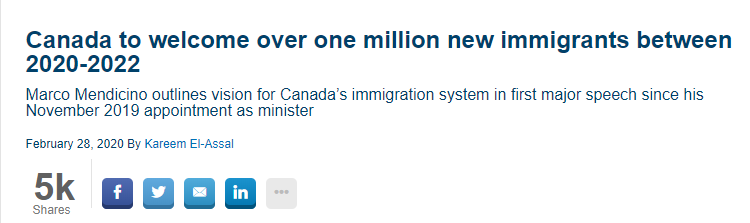 2019年的移民人数超过加国政府原先的目标,共有34.1万人成为永久居民。加拿大约80%的人口增长来自移民。据估计,这一数字到2033年将达到100%。