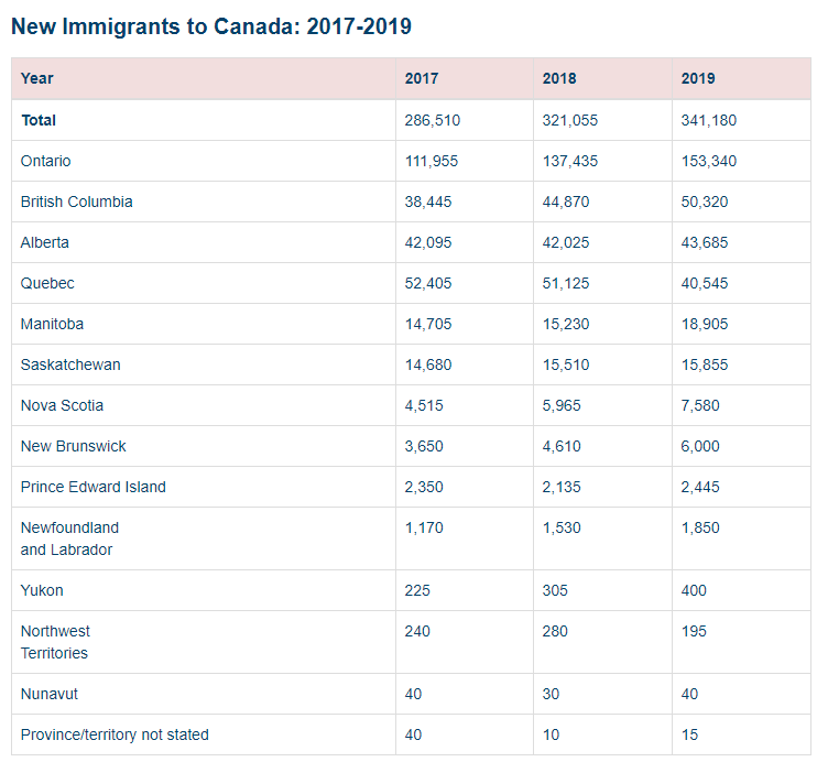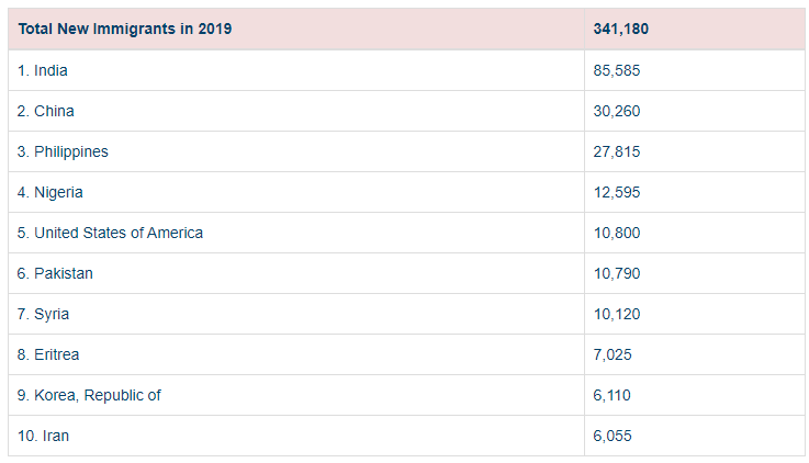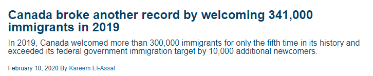 2019年,加拿大共接收了341,000新移民,创下接收国际移民的新纪录。