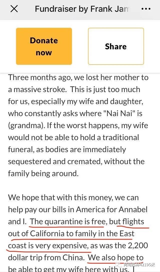 他自己说隔离是免费的,众筹是为了机票钱和争取把妻子接出来。