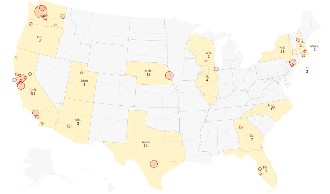 ● 截至3月5日晚9点,美国确诊人数的分布 / 《纽约时报》