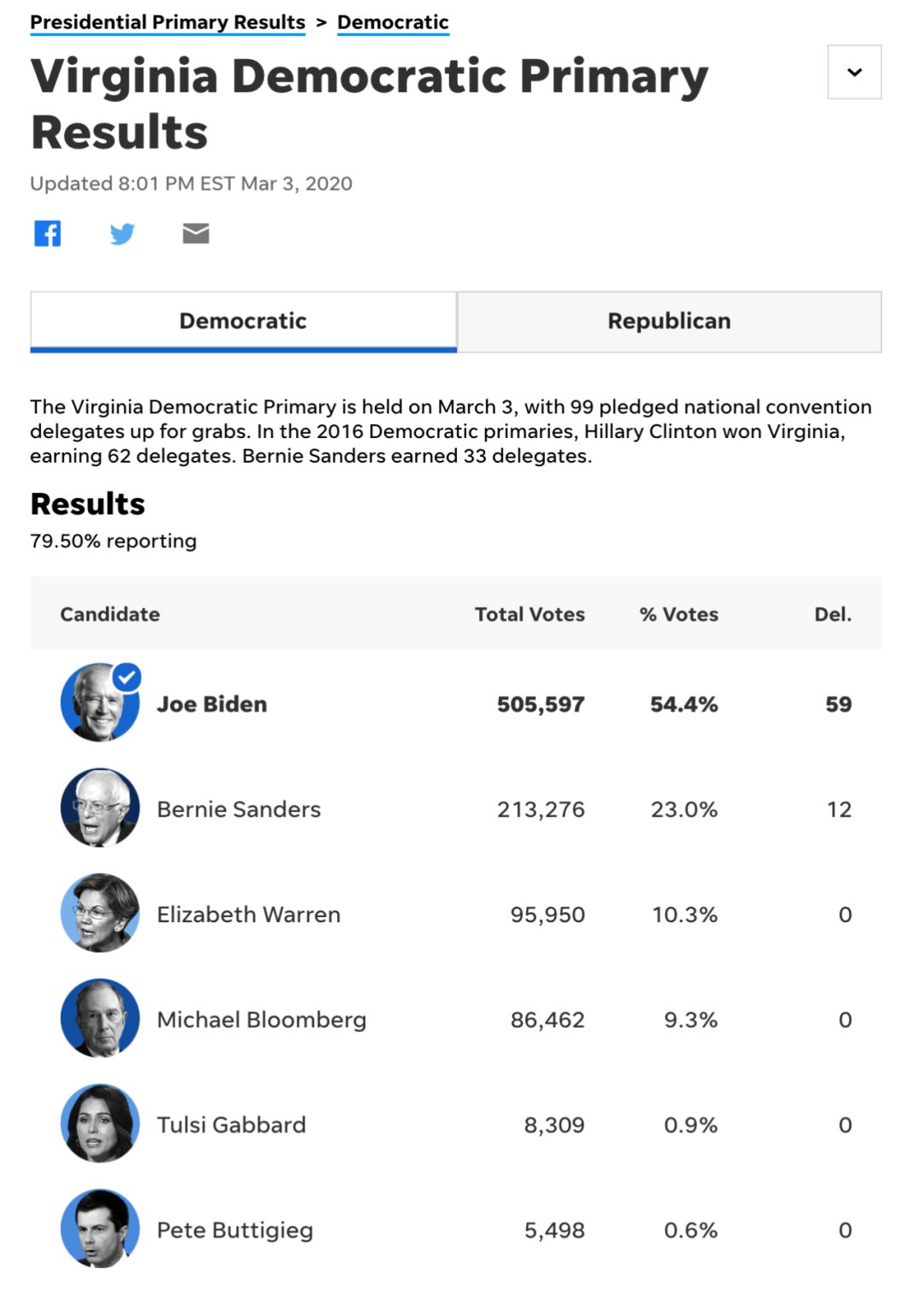 到了这会儿已经统计了近80%的选票,拜登在弗吉尼亚目前领先。