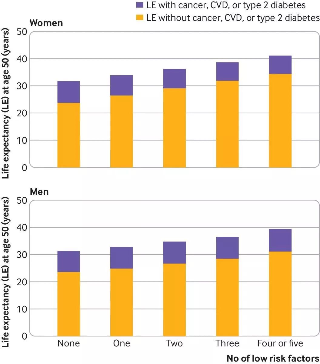 没有采取低风险生活方式的女性,在50岁时没有癌症、心血管疾病和糖尿病的预期寿命为23.7年,而遵循4-5种低风险生活方式的女性,无病预期寿命为34.4年,整整多了10年!