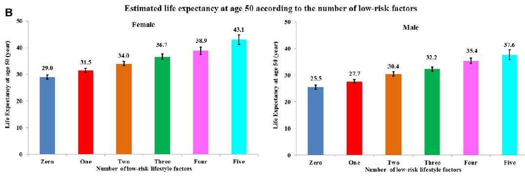 随着低风险生活方式数量的增加,50岁时的总预期寿命也不断延长:女性从31.7年延长到41.1年,男性从31.3年到39.4年。