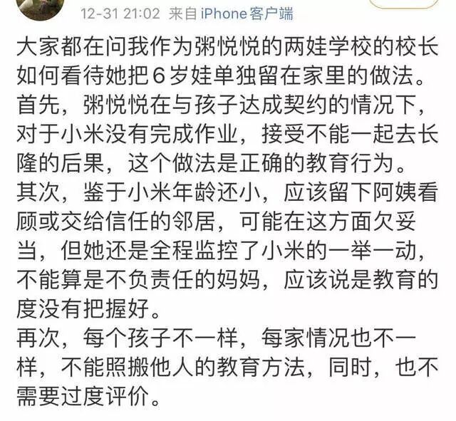 甚至连这位大V博主两位子女所在的广州某民办学校的校长都发博文辩称,这种做法是正确的教育行为,能做到全程监控,也属于负责任之举,只是教育的尺度没有把握好。