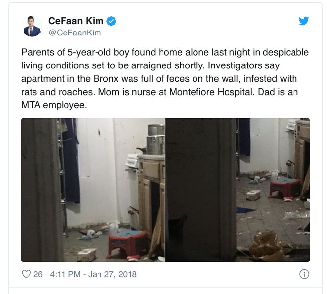 而在纽约,去年一名5岁的男孩被父母丢在布朗克斯一家满是蟑螂和老鼠的房间里,幸好一名联邦快递(FedEx)的快递员送包裹时意外发现这户人家里没有大人,当即报警。结果孩子告诉警方,他已经被父母独自丢在家中达到7个小时。这个孩子后交由儿童服务管理局监护,而孩子的父母——48岁的夏洛特·刘易斯(Charlotte Lewis)和59岁的威尔弗雷德·刘易斯(Wilfred Lewis)分别面临一级和二级指控。