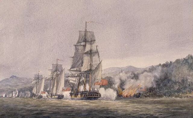 瓦库尔岛战役期间,美军的皇家野人号搁浅焚毁,并遭到英军炮击