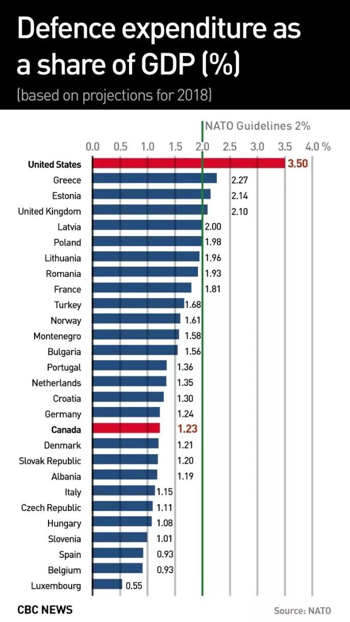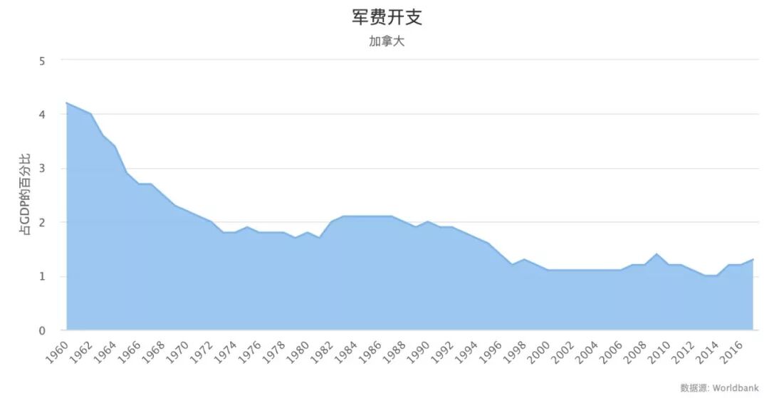 很难想象,加拿大这样一个幅员辽阔的国家只有6.8万名在役军人,而加拿大的军费占GDP比重也只有1.23%,半个世纪以来这一比例呈现下降的大趋势,在1960年时这一比例曾高达4%以上。
