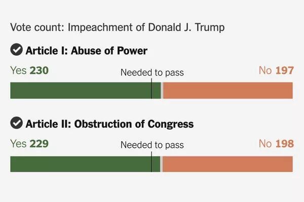 弹劾的条款有两条:一、滥用总统职权。二、阻碍国会调查。今天,众议院在六小时的辩论后投票,两项弹劾条款均以多数人同意通过。