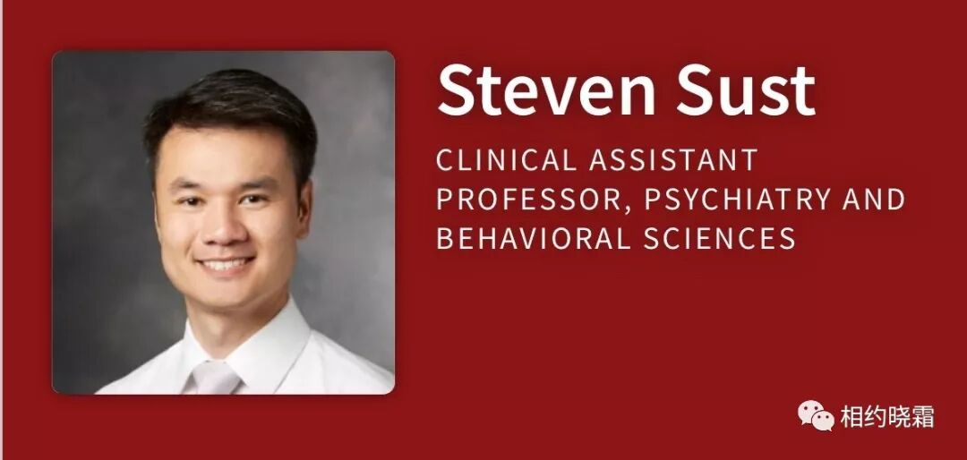Steven Sust(苏宇禾)医生是斯坦福大学精神病学与行为科学的临床副教授。他还在Santa Clara 和San Mateo 县医院担任精神科医生。他倡导和支持青少年早期介入项目和华人心理健康项目,经常在硅谷社区分享心理健康知识。