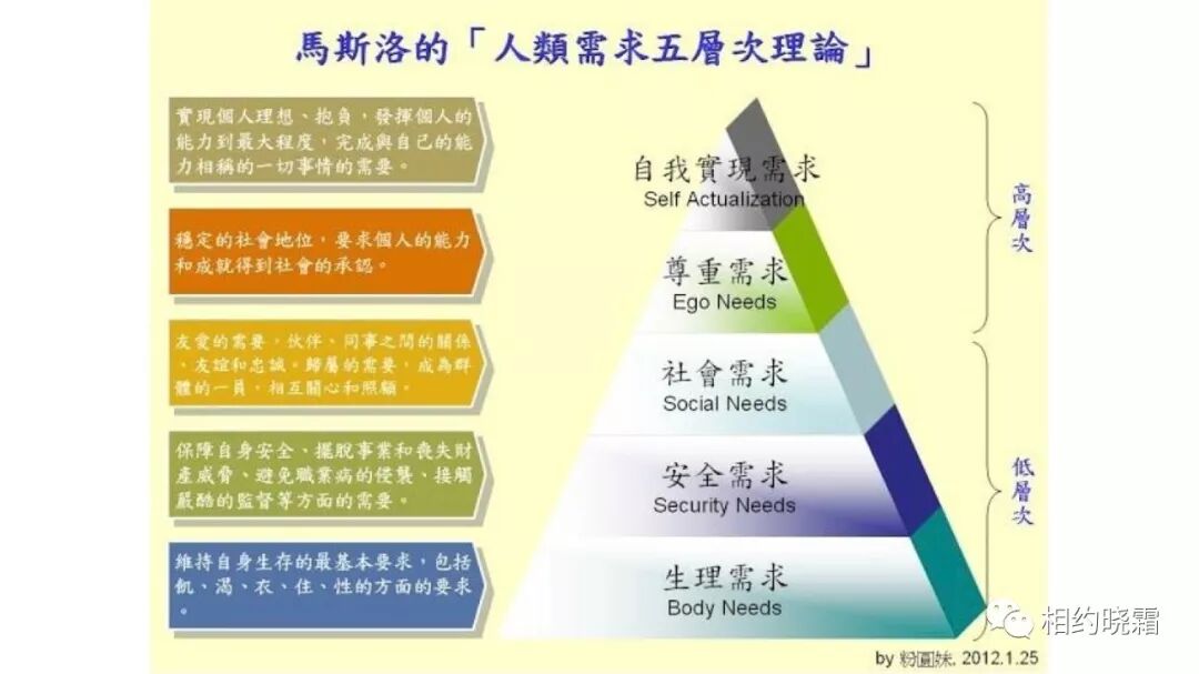 只有在基本的需要(低层次的需求)得到满足的前提下,人们才能够获得动力和基础去追求更高层次的需求。