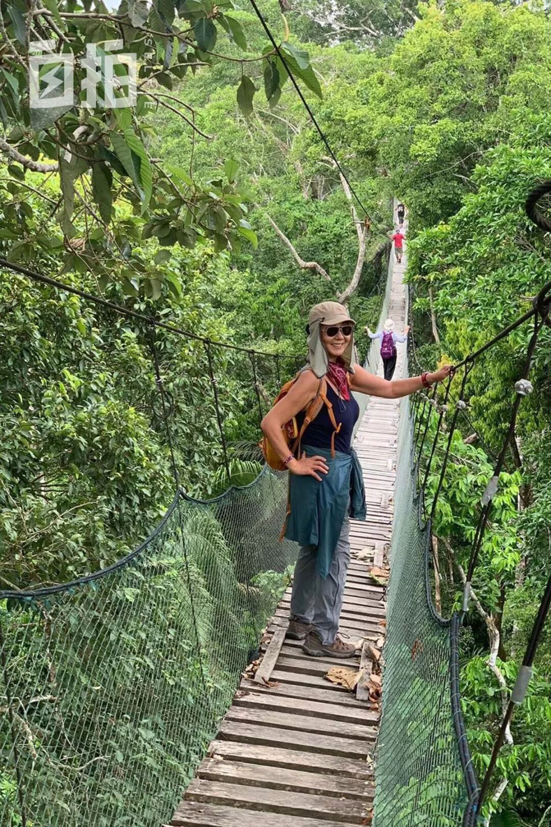 这是我在亚马逊河上走吊桥,之后又在热带丛林中徒步了2小时,才到达营地。一路上有鳄鱼出没,毒蝎挡路,十分惊险。而建在丛林中的营地,到处是蚊虫、毒蜘蛛,还不能用电。这些也吓不倒我,每天我钻进丛林看野生动物,滑峡谷索道,走树尖上的吊桥,乘独木舟漂流,真是太有成就感了。