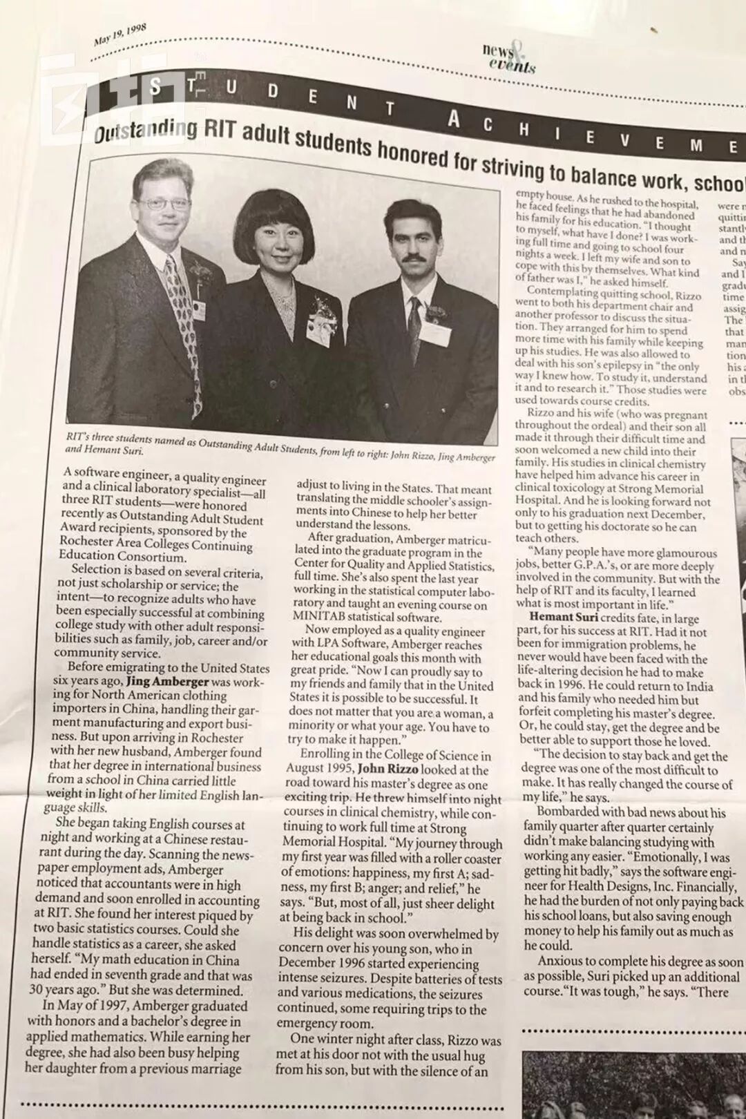 45岁时,我拿到了“最杰出学生奖学金”。这是1998年的罗切斯特大学校报,报道了我得到“年度最杰出学生奖”的新闻。