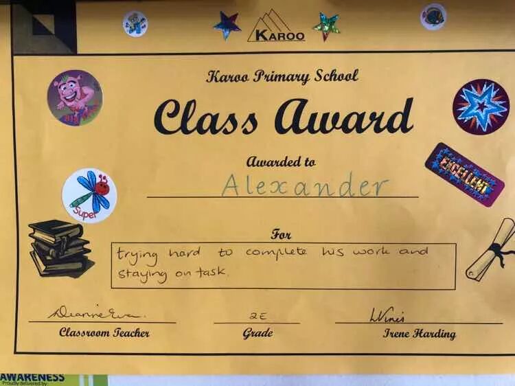 这样的方法是一以贯之的。我的孩子不是学霸,而且他很好动所以遵守课堂纪律成了一件头疼的事情,一开始甚至不能好好坐着完成一项作业。一年级的时候还不明显,到了二年级大部分孩子都可以好好坐下来的时候,这个问题就被提上了议事日程。但是一个学期结束后,孩子拿回来了一张奖状,是奖给班级里进步很大的孩子的,奖状里说,他现在可以努力的去做完一项作业了。