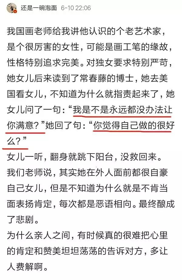具体事情,是一个留学常春藤读博士的女生在与她的妈妈争执后跳楼自杀。女儿最后留给妈妈的话是:“我是不是永远没有办法让你满意?”妈妈给女儿的答复是:“你觉得自己做的很好了吗?”于是女儿转身跳下阳台。