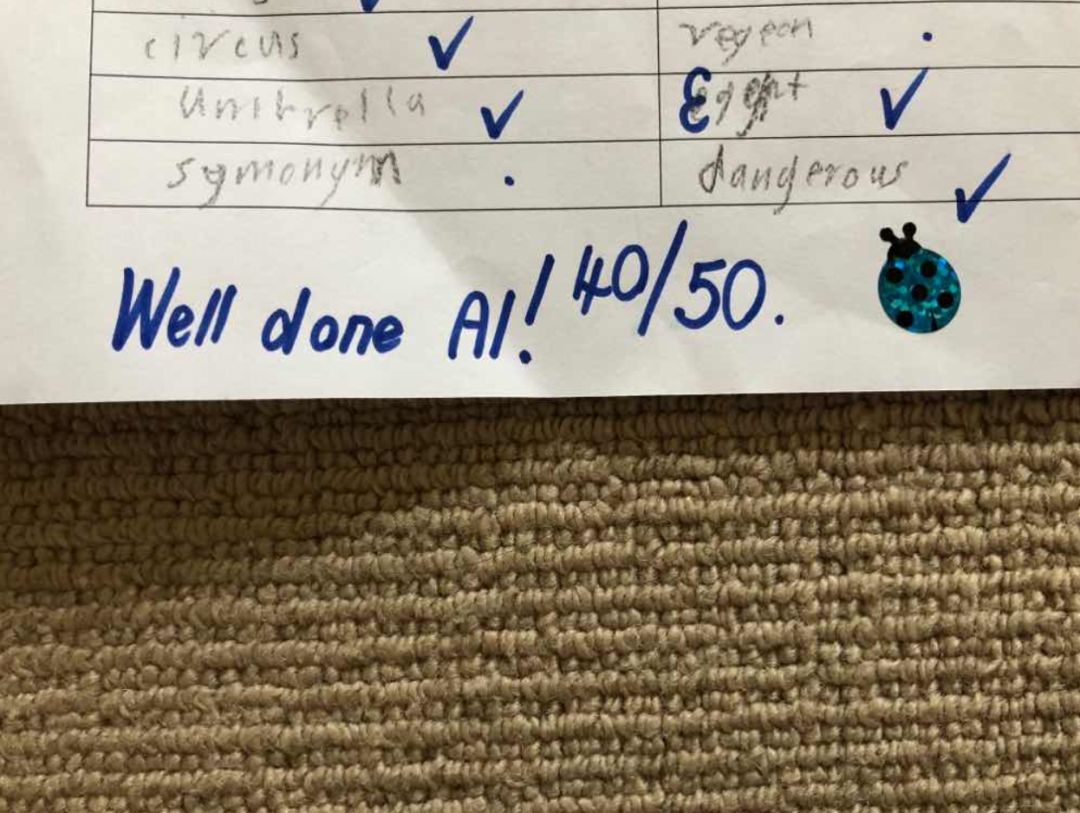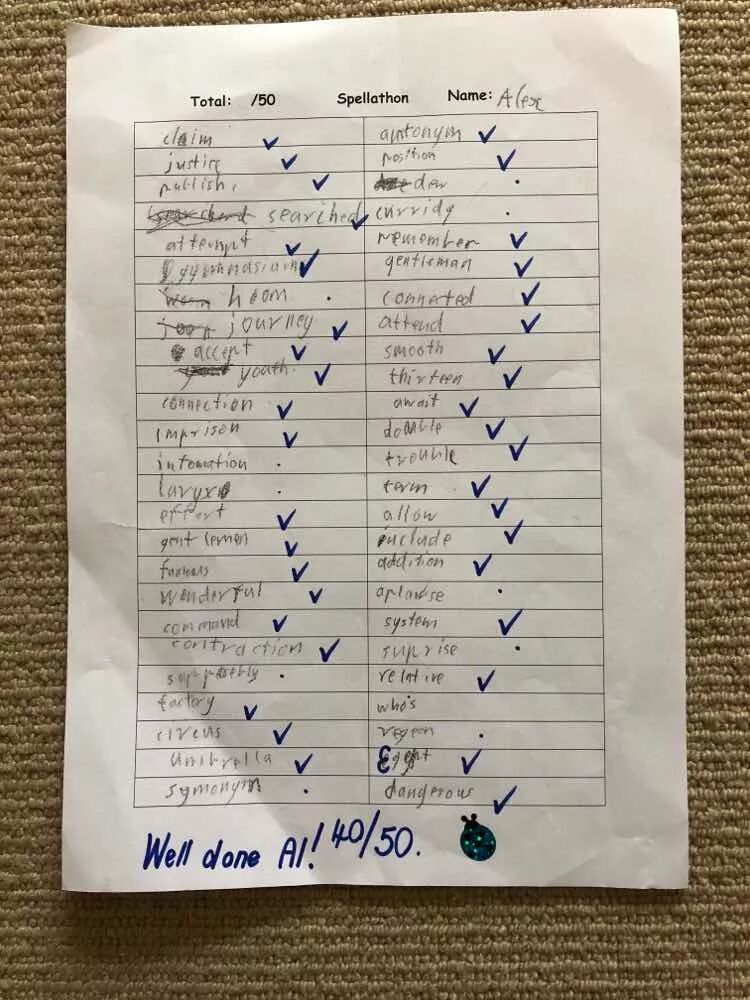 感谢老师写给孩子的“Well done!”,感谢老师给了孩子这么多学习的办法,更感谢老师的做法让我把那些愚蠢的话咽回了肚子,这种鼓励让孩子觉得学习单词和测试都是愉快的事情。