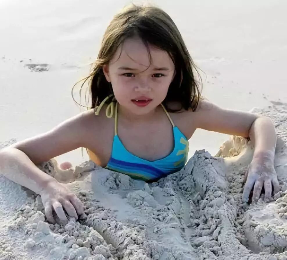 还有在沙滩上玩耍的格蕾丝,用手直接抓着沙堆,丝毫不顾忌弄脏了手,依然是一副天真烂漫的小混血模样。
