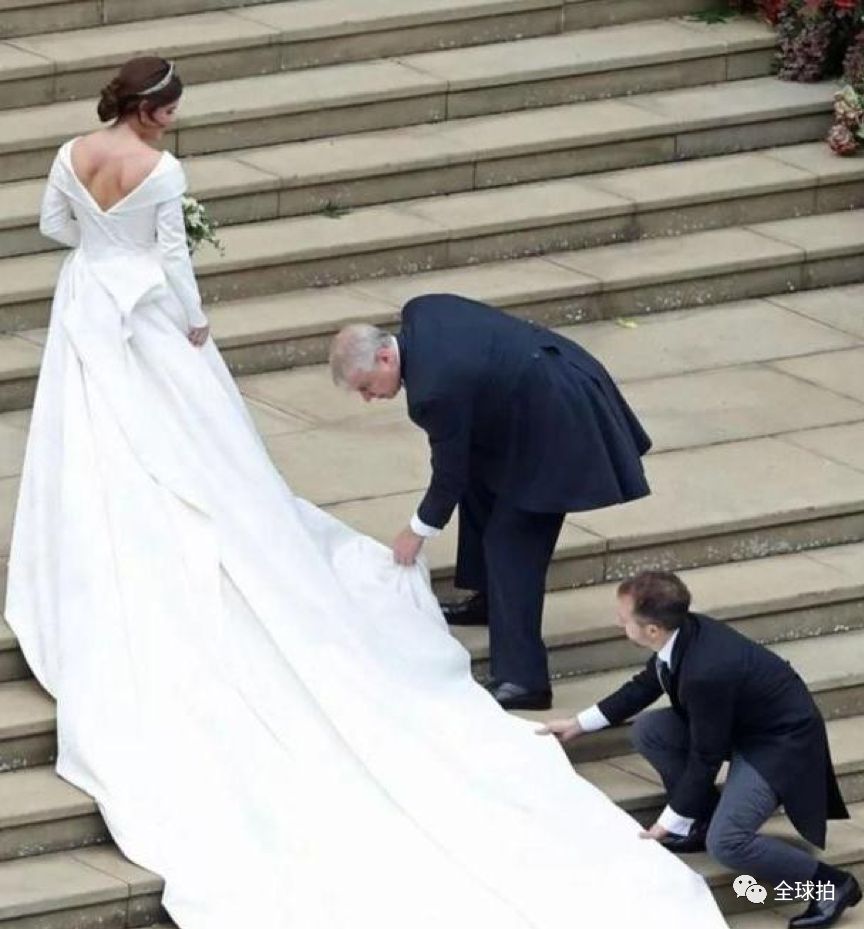 2018年尤金妮公主结婚,父亲安德鲁蹲在台阶上,为女儿整理婚纱裙边。