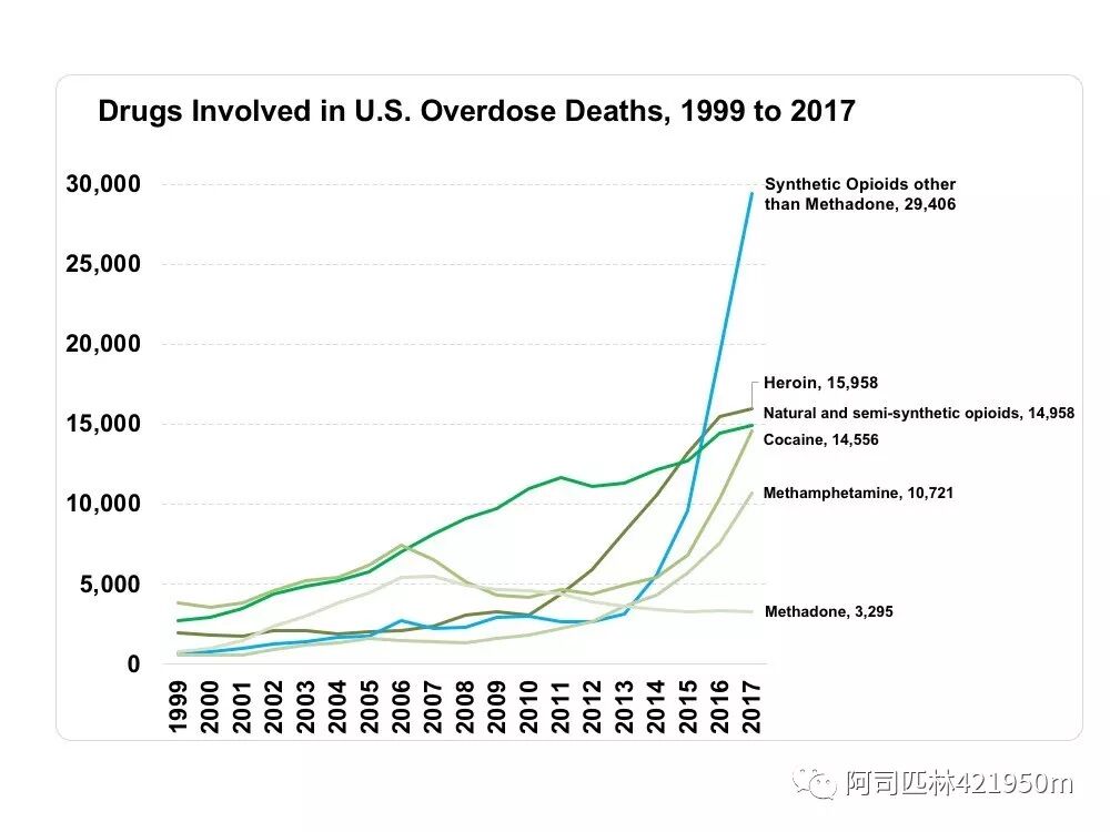 蓝线显示合成阿片类造成的死亡人数突飞猛进