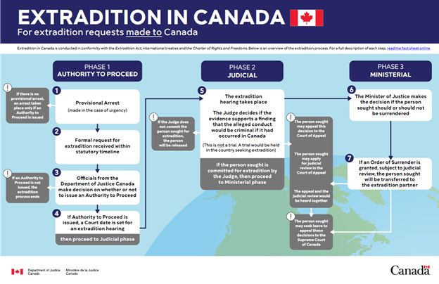 5.引渡庭审:最终,引渡案件法官将会决定,是否继续涉及被告的引渡程序。在初审裁决后,被告也可以针对审判结果上诉,并最高可以上诉至加拿大最高法院。
