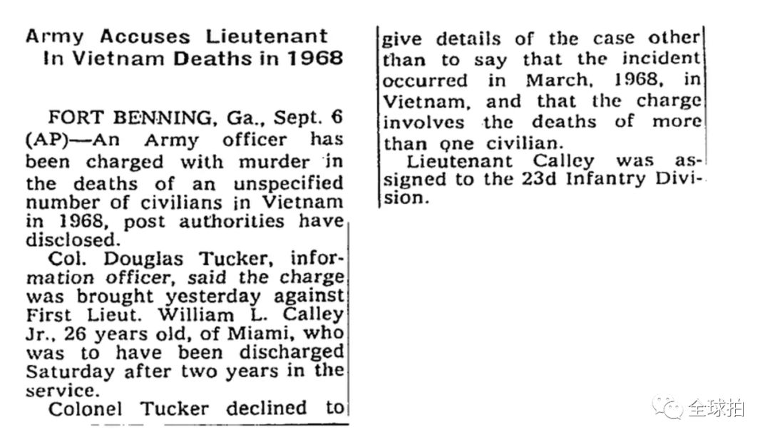 1969年9月,军方开始调查该案的主要指挥者,名叫威廉·卡利的26岁中尉,并以涉嫌屠杀109名平民进行起诉。但是因为军方仅仅公布了这条简短的消息,没有引起媒体的注意。纽约时报当时也仅在14页,刊登了如下的简短消息稿。