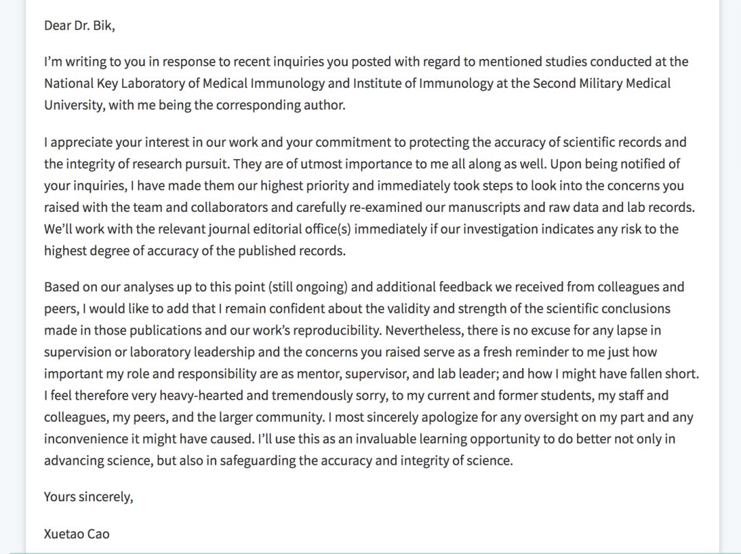 从11月17日晚起,曹雪涛被质疑论文所涉及的相关作者也开始在PubPeer网站上回应Elisabeth Bik,他们对一些论文图像相似的问题给出了解释,对一些则表示是准备结果时出现了编辑错误,并已联系期刊尝试修正。截止发稿,他们已对4篇论文进行了回应。