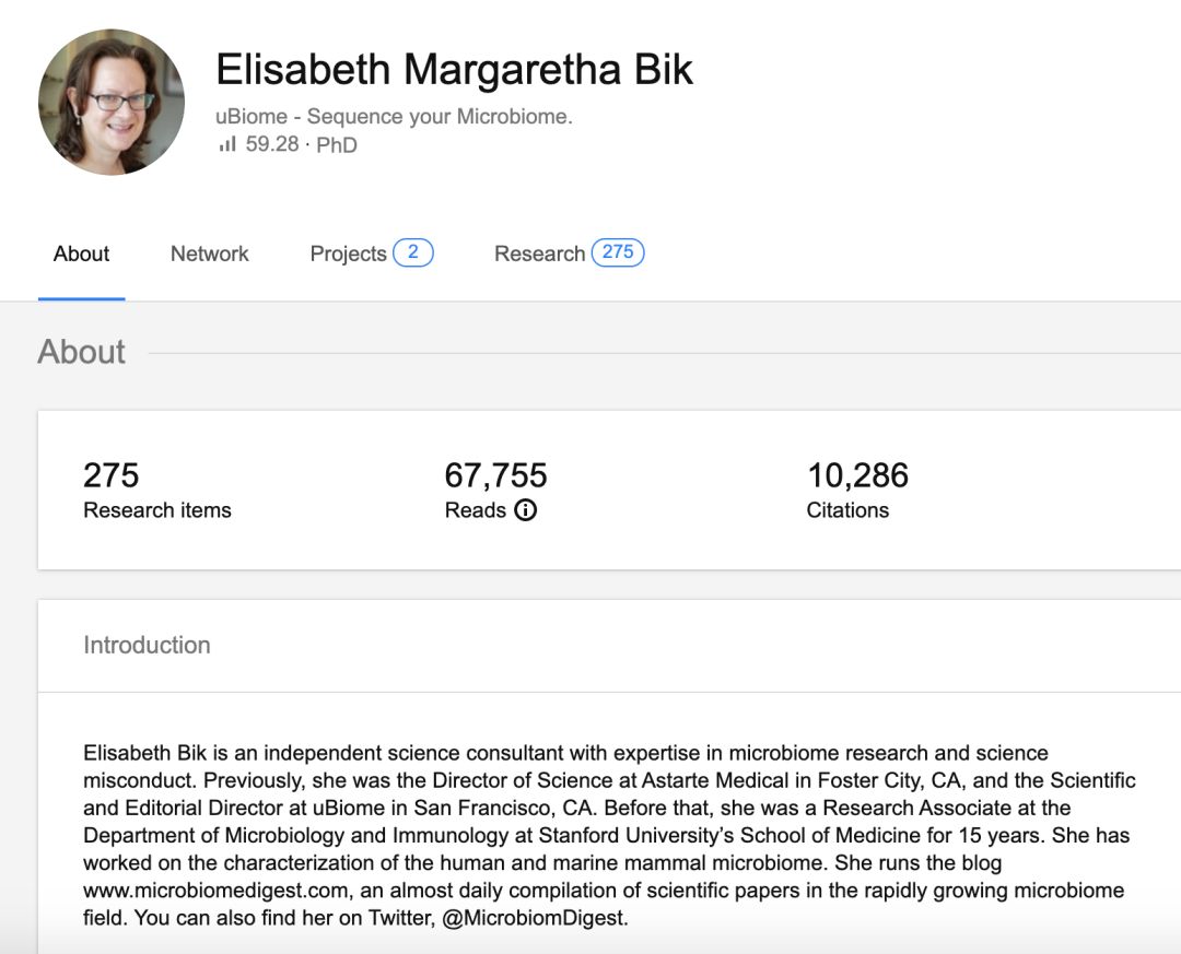 Elisabeth Bik在ResearchGate网站上的个人介绍