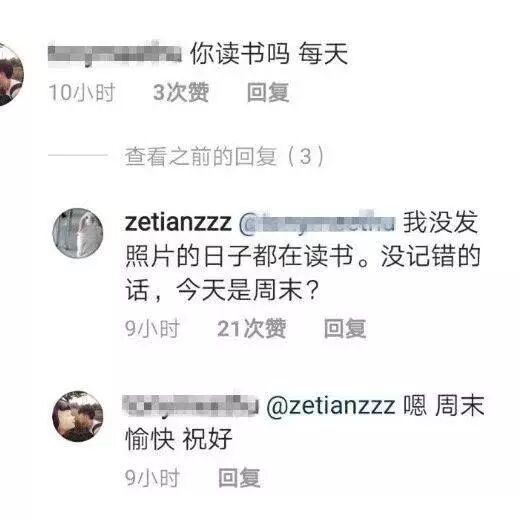 章泽天直接回怼道,”我没发照片的日子都在读书。没记错的话,今天是周末?“惹得对方忙说:“周末愉快,祝好。