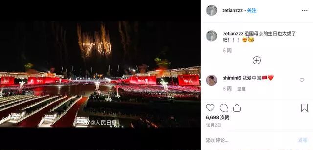 当然,即使是身在异国他乡,她也没忘在国庆的时候,祝福祖国生日快乐。