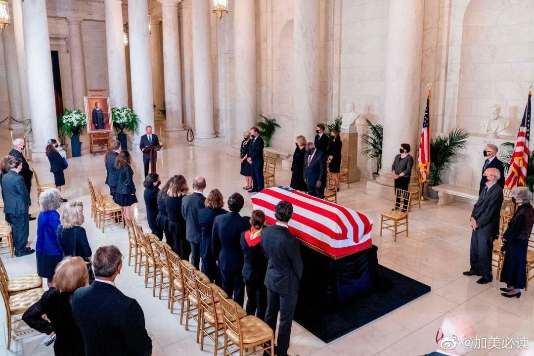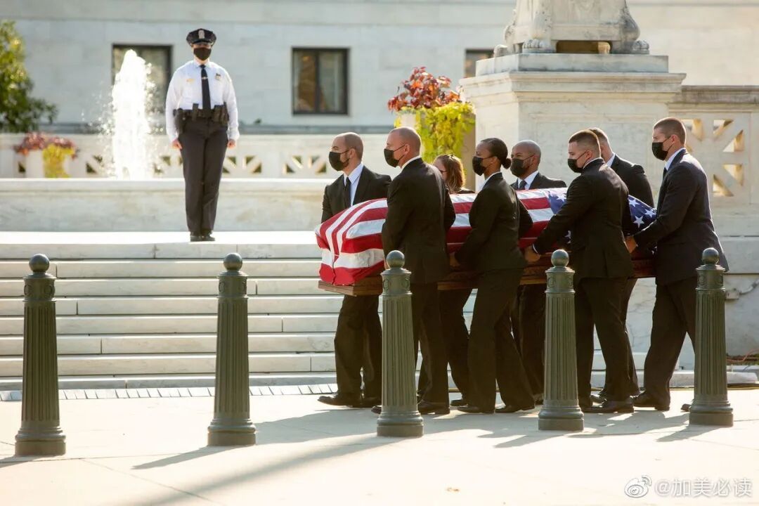 这个星期三,已故金斯伯格大法官的灵柩被放置在最高法院外的门廊下,以便人们表达敬意