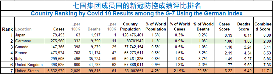 (作者根据约翰霍普金斯大学新冠疫情数据和联合国人口数据计算制作)日本感染比例得分为0.19,死亡比例得分为0.11,总分0.30,是七国集团中表现最好的,德国第二,加拿大总分3.45排名第三,法国总分6.53第四,意大利总分6.86第五,英国总分7.36,美国总分11.71排名远远落后。