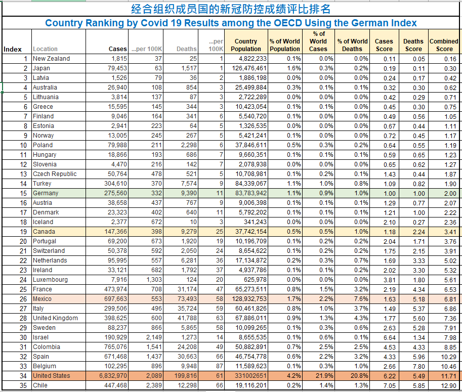 如果我们将德国的表现作为基准,分别将其感染比例0.9%和死亡比例1.0%设为基本指数1.00,简单相加就得到2.00作为这次全球新冠大考的合格分数。