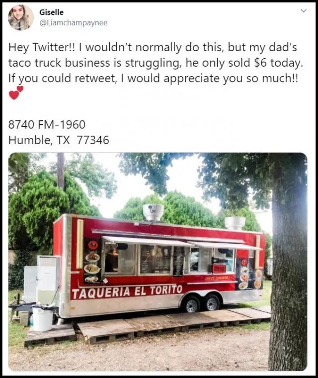 吉赛尔在推特上发了一个帖子。她说:”嗨,推特,我一般不这么做,但是我爸爸的taco车生意特别差,他今天只卖了6美元。如果你能够转发这个推特,我非常感谢!” 然后她附上了餐车的地址。